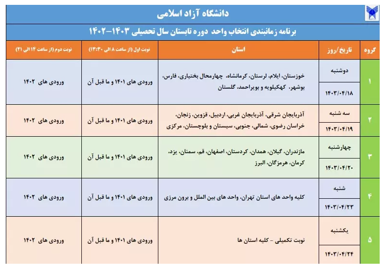 برنامه زمانبندی انتخاب واحد دوره تابستان دانشگاه آزاد اسلامی به شرح زیر است: