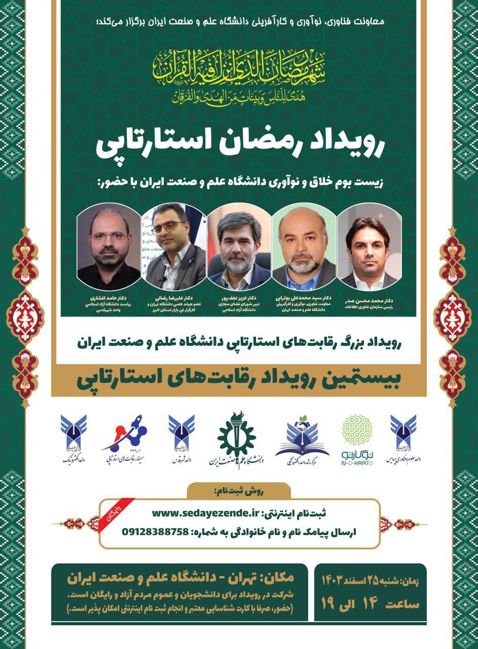 به گزارش روابط عمومی واحد الکترونیکی دانشگاه آزاد اسلامی، بیستمین رویداد رقابتهای استارتاپی، روز شنبه ۲۵ اسفند، از ساعت ۱۴ الی افطار برگزار خواهد شد. این رویداد فرصتی بینظیر برای معرفی استارتاپها، شبکهسازی و بهرهبرداری از موقعیتهای موجود خواهد بود.