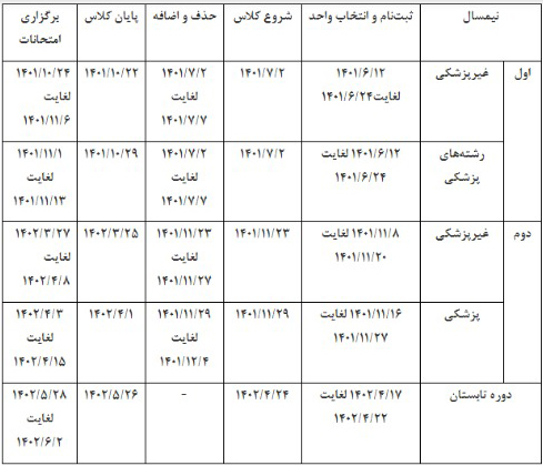 دستورالعمل تقویم آموزشی سال تحصیلی ۱۴۰۱-۱۴۰۲ رشته های غیر پزشکی و گروه علوم پزشکی دانشگاه آزاد اسلامی ابلاغ شد.
