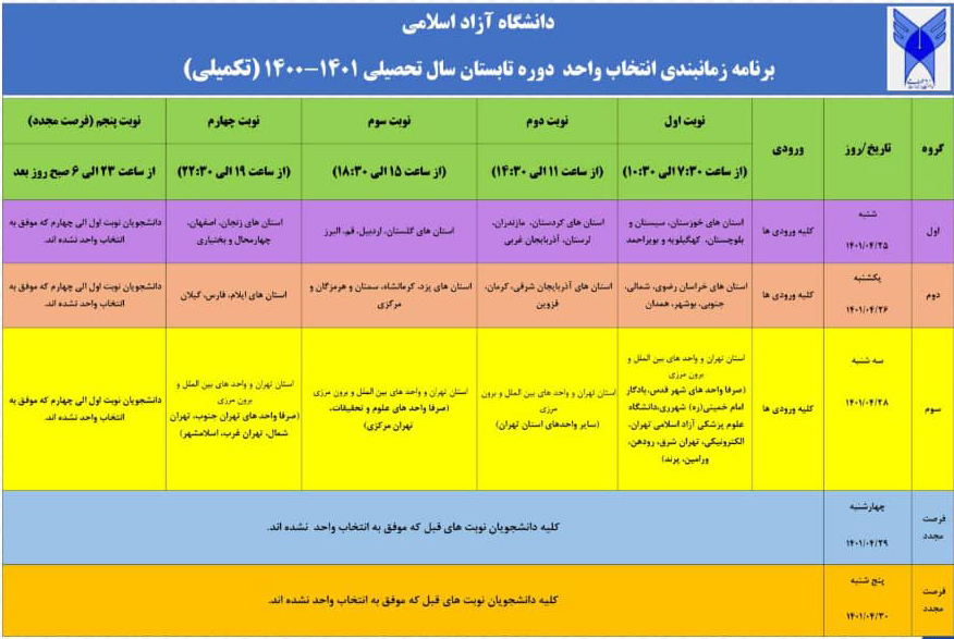 برنامه تکمیلی زمانبندی انتخاب واحد دوره تابستان سال تحصیلی 1400- 1401 دانشگاه آزاد اسلامی اعلام شد.