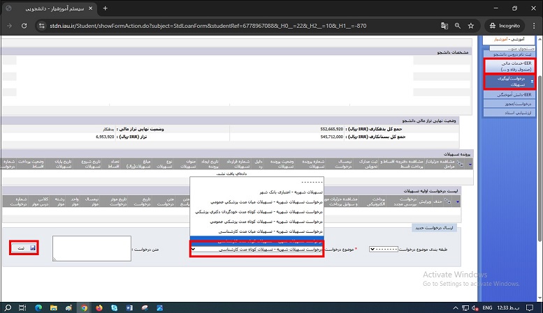 فرآیند ثبت درخواست تسهیلات در سامانه آموزشیار